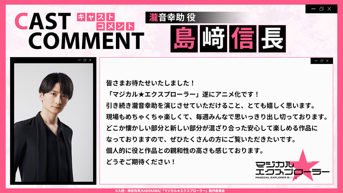 「マジカル★エクスプローラー」アニメ化を記念して、瀧音幸助役:島﨑信長さんからコメントが到着しました!